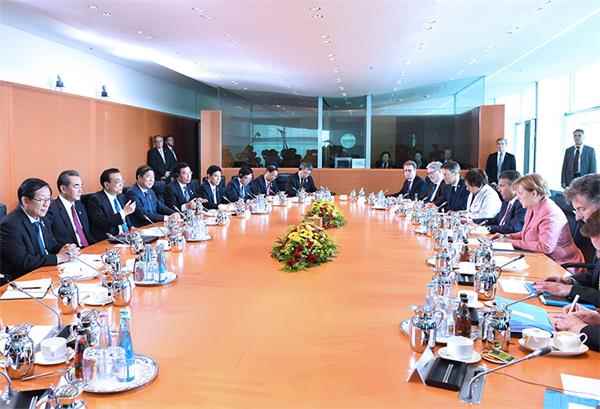 李克強指出,中德經濟互補性強,利益契合點多,合作潛力巨大。中方愿將“中國制造2025”與德國“工業4.0”等發展戰略更好對接,相互平等開放,把合作蛋糕做大,深化制造業、能源、航空、創新、中小企業等合作。希望德方為中國自主研發制造的大飛機C919取得歐盟適航認證提供支持。加強教育、文化、旅游等合作,進一步便利人員往來。中方支持德方主辦好今年二十國集團領導人峰會,愿攜手推進全球經濟治理,促進世界經濟強勁、可持續、平衡增長。