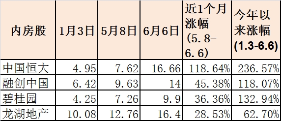 5月以來,除中國恒大以外,因超預期的基本面和持續的南下資金流入,碧桂園、融創中國、龍湖地產等為代表的內房股漲幅亮眼。據Wind數據統計,從年初至6月6日,碧桂園股價漲幅達132.94%,融創中國股價也翻倍漲了118.07%;龍湖地產亦有不錯表現,今年以來漲62.7%。內房股近一個月的股價漲幅均強于大盤指數。