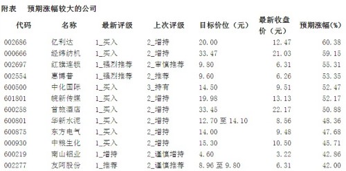 統(tǒng)計(jì)數(shù)據(jù)顯示,5月份以來(lái),券商共發(fā)布了147份上調(diào)評(píng)級(jí)報(bào)告,涉及上市A股138只,其中有78份給出了較為明確的目標(biāo)價(jià)格。結(jié)合最新收盤價(jià)看,目前億利達(dá)12.47元的收盤價(jià)相比中信建投5月2日給出的20元目標(biāo)價(jià)差距最大,預(yù)期上漲空間有60.38%。緊隨其后的是經(jīng)緯紡機(jī),21.03元的收盤價(jià)相比5月7日太平洋證券預(yù)測(cè)的33.47元目標(biāo)價(jià),預(yù)期上漲空間也有59.15%。整體上,5月份被機(jī)構(gòu)上調(diào)了評(píng)級(jí)且給出了明確目標(biāo)價(jià)的公司中,有63家機(jī)構(gòu)預(yù)期股價(jià)相比目前收盤價(jià)漲幅超過(guò)10%;44家預(yù)期漲幅超過(guò)20%;29家券商預(yù)計(jì)有望再實(shí)現(xiàn)30%以上的漲幅;12家公司的預(yù)期漲幅更是有望超過(guò)40%。