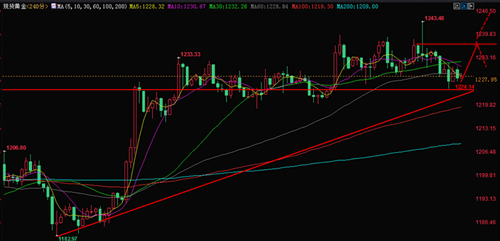 4小時來看,黃金走勢較為震蕩,MA短周期均線5日與10日均線交死叉向下運行,金價如果繼續(xù)下行,首先將測試此前旗形形態(tài)的上軌趨勢線支撐,只有跌穿該趨勢線在1223附近的支撐,那么金價或有望進一步擴大跌勢,但是如果金價短線繼續(xù)維持在1223上方,那么我們依舊看多,趨勢的轉變也不是那么容易的,不過昨日承壓1235下方,說明上方還是有一定阻力的,短期關注上方1235阻力,日內(nèi)操作上還是保持低多為好。
