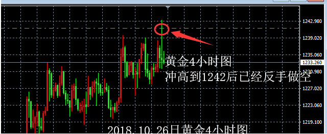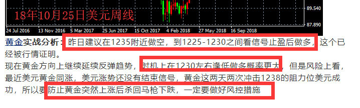 本周黃金基本上延續之前調整中上行的趨勢,因為延續之前加息,還有最近川普退出中導條約的影響,黃金和美元同時調整上行。本周我們一直建議在1220后逢低做多為主,基本上正確,跟隨這個思想操作的賺錢頗豐。也有很多分析師也有逢低做多的操作思路,但是很多跟隨其它分析師在周五晚上跟漲的客戶虧損嚴重或者被套,基本上沒有分析師能預料到周五的沖高回落,因為能預料到這個是需要多年的實戰經驗才能有的盤感和需要對市場深刻認識下才能有的,根據宮世泰分析師多年實戰的盤感,在周四晚上已經發文提醒(10.25日周四就提醒小心黃金上漲后突然殺個回馬槍),這個是宮世泰老師獨創的“先盾系統”體現。