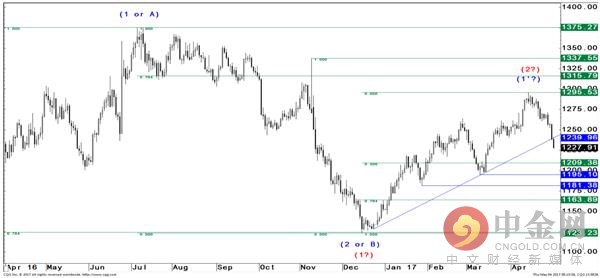 自從2016年7月高點1375下跌(自去年12月1124以來反彈的76.4%回撤位)后,一旦能否突破1216.40/1222.48(38.2%,0.5%位)后,則極有可能形成去年12月份1123起的二浪延長或者B浪的低點。