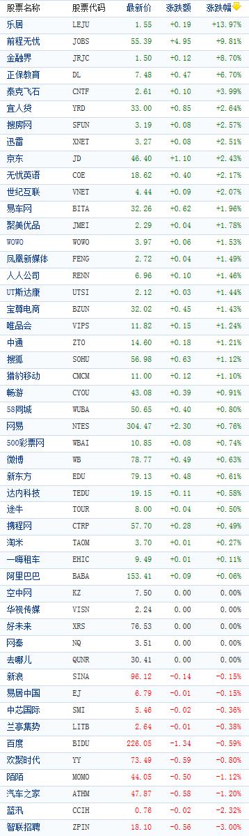 中國概念股周五收盤普遍上漲,京東(46.40 +2.43%)上漲2.43%報收46.40美元再創歷史收盤新高,阿里巴巴(153.33 +0.01%)上漲0.06%報收153.41美元,百度(226.05 -0.59%)下跌0.59%報收226.05美元;樂居飆漲13.97%報收1.55美元,前程無憂(55.39 +9.81%)上漲9.81%報收55.39美元,金融界(1.50 +8.70%)上漲8.70%報收1.50美元,正保教育(7.48 +6.70%)上漲6.70%報收7.48美元,泰克飛石上漲3.99%報收2.61美元;智聯招聘(18.70 +0.21%)下跌3.00%報收18.10美元。