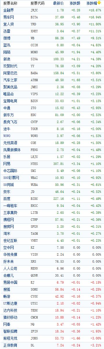 中國概念股周一收盤普遍上漲,阿里巴巴(158.84 +3.59%)上漲3.60%報收158.84美元,京東(47.56 +2.50%)上漲0.52%報收46.64美元,百度(227.16 +0.49%)上漲0.49%報收227.16美元;金融界(1.78 +18.67%)飆漲逾18.67%報收1.78美元,易車網(37.72 +17.03%)上漲16.94%報收37.69美元,宜人貸上漲11.80%報收36.95美元,迅雷(3.64 +11.31%)上漲11.31%報收3.64美元,微博(86.26 +9.51%)上漲9.51%把手86.26%,阿里巴巴,京東,微博集體均創歷史收盤新高;前程無憂(53.73 -3.00%)下跌3.00%報收53.73美元,正保教育(7.22 -3.48%)下跌3.21%報收7.24%。