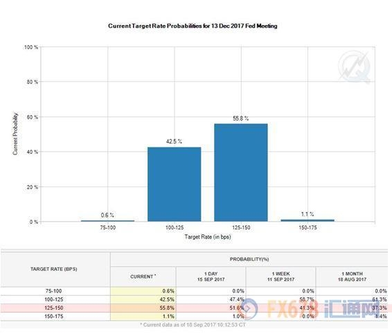 圖上顯示,目前市場將美聯儲12月再加息一次的概率從41%上調至57%,并預計本周的9月FOMC會議將不會宣布加息,可能只宣布開啟縮表。