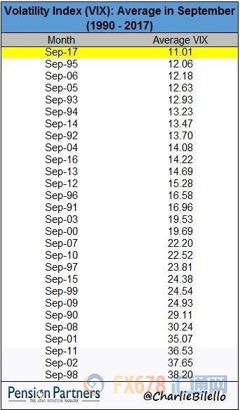 咨詢機構Pension Partners研究主管Charlie Bilello發現,VIX指數已經連續五個月跌破10的關口,也是有紀錄以來在9月首度”破十,代表今年9月或為史上波動性最低。