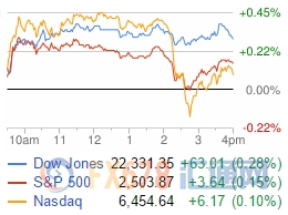 以此同時,市場風險偏好情緒異常高漲,美股強勢走高。標普道指再創收盤紀錄新高,標普500指數收漲3.64點,漲幅0.15%,報2503.87點。道瓊斯工業平均指數收漲63.01點,漲幅0.28%,報22331.35點,為連續第七個交易日上漲、且連續第五天創收盤紀錄高位。納斯達克綜合指數收漲6.17點,漲幅0.10%,報6454.64點。