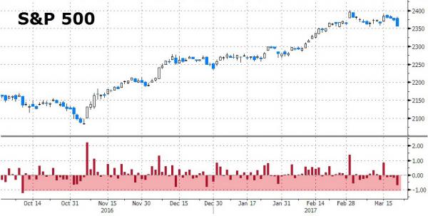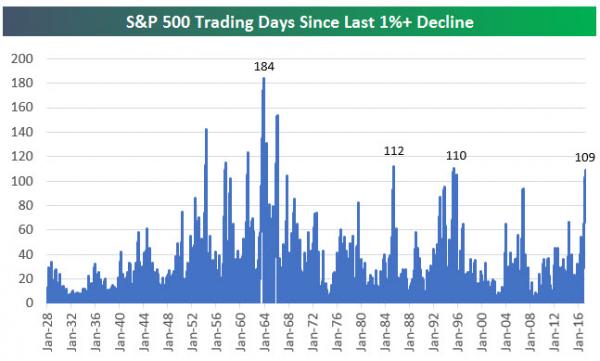 在過去的110天里,美股從未出現過1%以上的跌幅,這個記錄在昨天告終。自特朗普贏得大選以來,投資者已經不太習慣美國股市遭大幅拋售了,上次標普500指數下跌1%或以上是在110個交易日以前的10月11日。根據湯森路透數據,在之前的兩年里,每11個交易日就有一個交易日標普500指數跌幅在1%或之上。