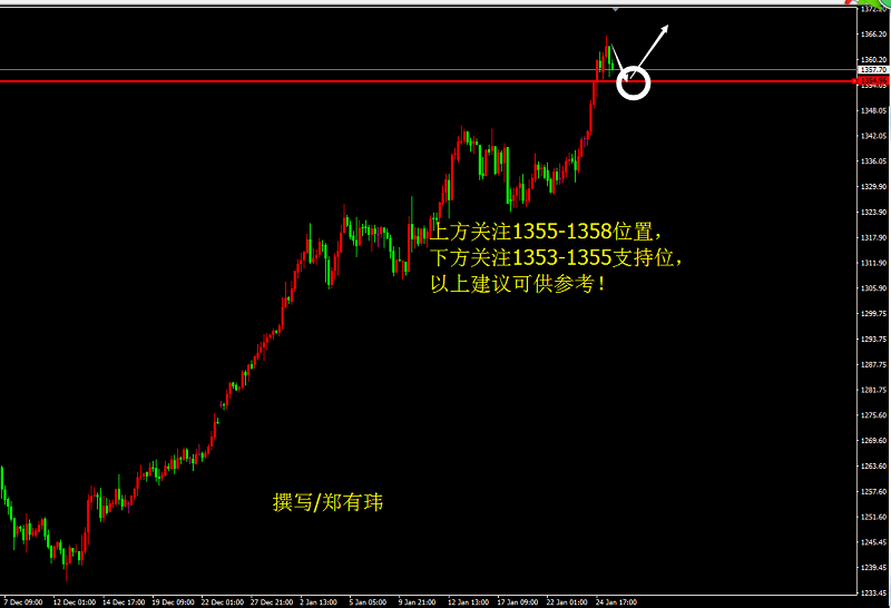 近日黃金持續走高!讓看空的朋友大失所望!而黃金繼昨日收中陽后,日內延續上漲態勢,目前黃金運行在1350上方,短線上上下震蕩也沒跌破1350,短期內黃金上方阻力則位于1365位置,而下行方面則需關注1353-1355附近支撐,該位置則是近期黃金支阻互換的切入點。日線上,布林帶縮口,近期金價依托MAD5與MAD10震蕩上行,有瑋個人建議日內回落可重點關注該處支撐,而上行方面則重點關注1366美元一線壓力。指標來看,MACD指標快慢線粘合運行,短線一路上沖,Sto指標向上運行,指標中性偏強,日線整體走勢偏多發展;4小時上,隨著昨晚后半夜的一波上漲,短線上行已經突破阻力去年高點1357,凌晨4點再次創高點1362,預計在經過盤整之后上方空間才能進一步打開,MA5均線上穿MA10均線形成金叉,指標MACD方面快慢線也是形成金叉。綜合來看,黃金在連續的震蕩走勢之中,多頭節節攀升,低點不斷向上方挪動,高點不斷刷新,目前來看金價仍然有上漲的空間,上方也未見明顯強壓位,晚間操作上有瑋個人建議回調做多為主,上方重點關注1366-1368一帶阻力,下方關注1355-1353一帶支撐。布局建倉連線筆者鄭有瑋,有套單的朋友可轉接鄭有瑋本人,由于筆者鄭有瑋不知道你們套單的點位以及倉位的詳細情況,不好給出相應的解套策略,需要解套的可單線有瑋。