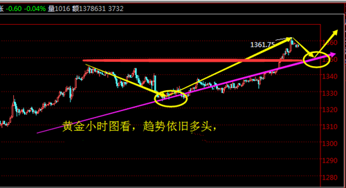 ??從短期小時(shí)線的走勢來看,亞盤震蕩上行,破前期高點(diǎn)回撤,歐盤延續(xù)下行走勢,但是要跌也要見底,但是這一波走勢只是明顯走出沖高回落,短期依舊看好黃金上漲,不能因?yàn)榈藥酌澜穑透淖儺?dāng)初最真實(shí)的想法,再加上連陽走勢回撤是誘空,階段性回撤很正常,除非哪一種深度回撤,就謹(jǐn)慎去做多,而是順著趨勢來布局,短期小時(shí)線關(guān)注1355美元的底部支撐,晚間只要給到多一次沒有問題!綜合近期的走勢來看,筆者認(rèn)為今日上方重點(diǎn)關(guān)注1365-1368美元的阻力位,下方關(guān)注1355美元底部支撐,操作方面回落布局短線多。