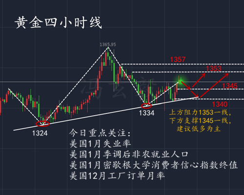 昨日亞盤開盤1344一線,開局出現一波誘空后反彈至高位1346.9一線回落,相信不少朋友被早間一波拉升而弄得迷失方向,但是作為合格的投資者理性的面對一切才是我們應該做的,不要追漲必跌,追跌必漲,成為你生活的常態。1346.9一線明顯處于高位,且處于小時線上軌,在未出現開口的情況追多顯然不現實,上方壓力重重,做空回落是我們最好的選擇。白盤行情如期回調,最低至1337一線。對于晚間美盤初請數據實在不盡人意,對行情影響可以忽略不計,1337一線觸底形成反彈,晚間再次形成震蕩走高,最高到1350.9一線,最后收盤1348一線。