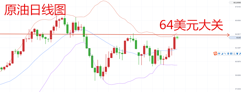 從日線圖走勢上可以發現,布林帶三軌目前上軌在64一線走平,昨日的短線拉升并沒有改變上軌的運行軌跡,反而是中下軌開始大幅拐頭上行向上收口,這就表明雖然目前原油多頭強勁,但上方64依然是一個較強的壓力位,可能暫時還無法突破。之前的利好已經幫助油價連續突破62和63美元,而如果想要進一步突破64美元,恐怕還差一點點力量。而且此前又一次原油價格在突破64美元之后迅速被打壓連續下跌回吐漲幅,所以64美元是目前最強的一道坎。所以雖然目前原油價格在64美元門口,但今晚兩大關鍵因子“EIA庫存”“美聯儲決議”將會進一步決定原油的走勢變化。如果能夠帶來連續的利好,可能在今后一段時間都會支撐油價的上漲,突破年初66.66美元也是指日可待,但如果出現連續的利空,恐怕油價近段時間內還是要面臨在60美元附近運行的狀態。