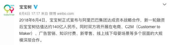 6月4日,寶寶樹宣布與阿里巴巴集團達成資本戰略合作,并稱新一輪融資后估值達到約140億人民幣。