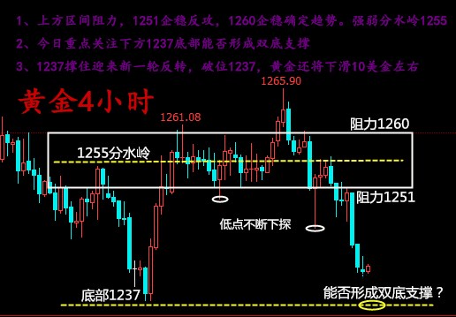 周初沖高回落,周二下探回升,周三大陰破低。周四慢牛修正,反彈沒有延續性,早盤在1241一線開始震蕩上行,反彈力度依舊不是很大,日內整體波幅6美金左右,在美盤CPI數據利多的影響下,小時線持續連陽上漲,最高反彈1248附近,后市震蕩收尾。昨日行情還是處于修正期,并沒有多空的對壘和對底部再次的確定,周三日線的大陰并未帶動行情再次轉跌下行。那么1241一線底部是否已經和1237一樣雙底構成?雖然兩者沒有很大的關系,但是可以說這段已經走完了?我們繼續看行情分析: