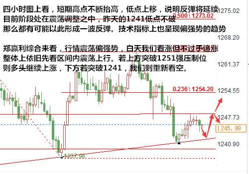 四小時圖上看,短期高點不斷抬高,低點上移,說明反彈將延續,目前階段處在震蕩調整之中,昨天的1241低點不破,那么都有可能以此形成一波反彈。技術指標上也呈現偏強勢的趨勢,鄭贏利綜合來看行情震蕩偏強勢,白天我們看漲但不過于追漲,整體上依舊先看區間內震蕩上行。若上方突破1248強壓制位,則多頭繼續上漲。