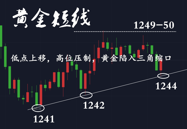 午間點評:黃金小時線上,低點1241-1242-1244持續(xù)上移,表明下方支撐明顯,但黃金反彈力度有限,受制于1249-1250壓制。黃金陷入三角縮口震蕩,耐心等待黃金破位區(qū)間選擇方向,周尾保持謹慎操作!
