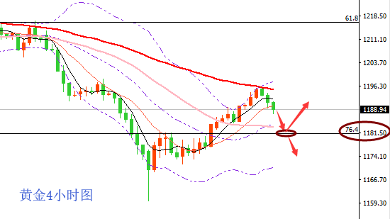 4小時圖上,布林帶三軌朝下縮口運行,MA5移動平均線與MA10移動平均線呈金叉近粘合態朝上運行,趨勢指標MACD快慢線位于零軸下方交金叉上漲紅色動能逐步放量,雙線低位金叉顯示短線有觸底反彈需求,因此,短線黃金行情還有進一步上漲勢能。綜合看來,黃金價格會迎來一波反抽,所以,今日黃金價格下方重點關注1180-1182一線支撐,上方關注1196-1198一線阻力,日內操作思路上高升聚金個人建議以回調做多為主,反彈高空為輔。