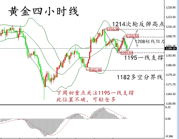 黃金本周維持區間修正運行,沒有走出明確的方向,自1214附近受阻回撤,周五的反抽力度并不強。目前需要考慮兩種情況,美元大幅走低后是否反彈,黃金自1160一線強勢反彈之后回踩繼續漲,還是轉入震蕩,第一,美元若走反彈,黃金必然會再度回撤,回撤的幅度就要看美元反抽的力度。黃金本周收盤于1200一線,一旦再度走弱跌破1200關口,那么低位震蕩和筑底的時間將會拉長,所以,從這種角度考慮,我們對黃金多頭不能過于樂觀,即使黃金目前在這個位置出現連續性回調,也是正常的技術走勢。黃金短線方面,目前下方重點關注1195-1190區域的支撐有效性,只要不跌破這個區域,都只是回踩,周線方面,黃金已經有見底的趨勢,接下來的震蕩回落都是測底為主,所以操作方面,逢1195依然是最佳的做多入場位置。目前4小時級別有收口跡象,接下來重點關注1215——1195區域內高拋低吸的機會。1220下方,黃金還將維持一段時間的震蕩修正運行,下周初齊浩銘認為以1200下方低多為主,靠近1220一線做空為主,周初消息面清淡行情可能會運行緩慢,交易機會可能會比較少,我們多看少動,避免盲目下單頻繁做單。