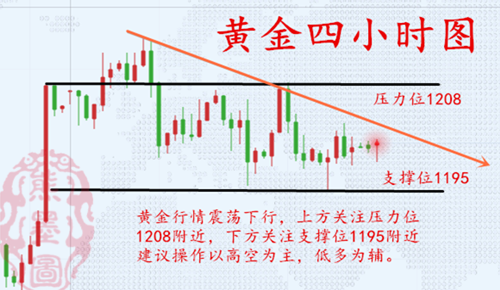 而從技術面上分析,上一周金價周初沖高,后面幾個交易的回落走弱,整體式維持震蕩下行的趨勢;而周初金價仍然處于自上周以來的下行通道之中,雖然目前日K線持穩于日線布林帶中軌支撐,但是中軌隨時有下破風險。短線4小時圖上看,金價短期受制于4小時布林帶中軌壓制,布林帶短線有縮口跡象;4小時圖上黃金的下行趨勢更加明顯,那么我們在行情破位之前繼續看震蕩偏弱。一小時級別上一直受下跌趨勢線的壓制,反彈高點不斷下行,低點越來越低,多頭反抗力度變弱,早盤空頭強勢,即便反彈也會在1205位置受阻。