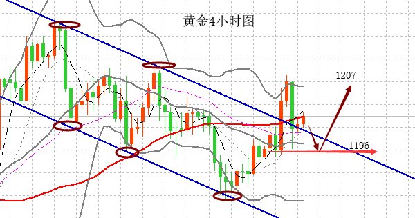 對于目前的行情,首先從日線上面可以看到,日內(nèi)黃金再次上漲,突破1200一線關(guān)口,破位BOLL中軌一線,KDJ三線拐頭有所上行,同時我們從MACD指標(biāo)快慢雙線再次上行紅色多頭能量柱放量,使得行情破位之后有所上行,這也表明黃金上行動能足夠,同時表明了黃金上方依舊是存在空間!4小時級別上看,黃金昨晚快速拉伸反彈突破小區(qū)間的壓制線,趨勢線的打破,這意味著行情將選擇新的方向,那么操作上建議回調(diào)參與多單,目前黃金關(guān)注震蕩調(diào)整,確認(rèn)調(diào)整結(jié)束后黃金將開啟新一輪的走勢,小時線上看,行情日內(nèi)有回落至BOLL中軌一線,隨后行情開始了反彈上軌,最高達(dá)1206一線,數(shù)據(jù)公布之后,行情有高位承壓,KDJ三線有承壓下行。綜合來看,牛權(quán)勝個人認(rèn)為黃金上方依舊存在很大空間,同時我們可以從昨天晚間行情看到,黃金回落至四小時線中軌支撐反彈,同時表明了黃金下方空間不斷的減少,今日操作上牛權(quán)勝個人建議下方短線重點(diǎn)關(guān)注四小時線1196一線支撐,上方短線關(guān)注1207一線壓力,操作上牛權(quán)勝個人建議圍繞區(qū)間1196-1206操作,重點(diǎn)回調(diào)多為主,上方壓力位不破可輕倉空!破位順勢操作即可!
