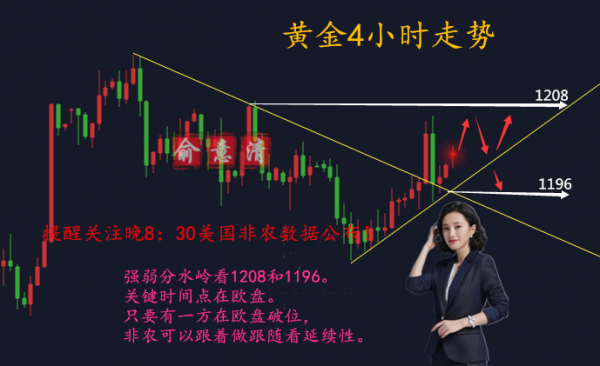 同樣到了晚間,在兩大數據面小非農和初請失業金的刺激下,黃金也沒有出現再次沖高的動力,再次的受阻于俞意清老師強調的分水嶺位置,不破依舊不做反轉走強考慮!空單也是實時的布局,沒有能把握一個最高的高位,而是在回撤下行1205一線布局入場。隨后黃金雖然多空較為膠著,一直是徘徊在1202-1203位,然而在午夜,黃金直接放量下行,跌至早間1196位,直接是回吐了早間所有的跌幅,也是走的比較刺激,不知道大家把握的怎么樣呢?
