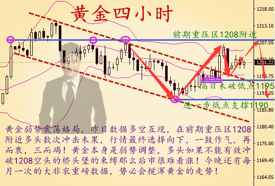 黃金弱勢震蕩格局,昨日數據多空互現,在前期重壓區1208附近多頭數次沖擊未果,行情最終選擇向下,一鼓作氣,再而衰,三而竭!黃金本身是弱勢調整,多頭如果不能有效沖破1208空頭的橋頭堡的束縛那么后市很難看漲!今晚還有每月一次的大非農重磅數據,勢必會攪渾黃金的走勢!濤赫認為非農前難有較大的走勢看空間,今日操作上濤赫個人建議反彈做空為主,上方關注1208一線阻力,不破可空單進場,下看1195附近,下破進一步看向1190-1188一帶支撐。晚間迎來非農數據,大家注意控制好風險,行情瞬息萬變,更多實時策略盤中指導給出。