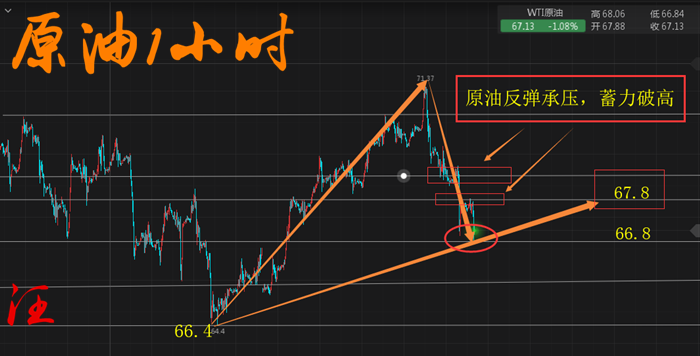 多單:66.8一線進多,止損0.5美金,目標67.5——67.8