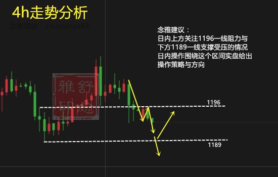 黃金周K線收一根帶上下影線陰線。從K線角度來看,金價仍然位于最后一根大陰線的的范圍內震蕩。整體趨勢上仍然偏弱。日圖金價圍繞在20日均線上方震蕩,MACD在零軸下方金叉向上,預示金價仍然存在反彈回升的可能。而從4小時圖形態上,金價目前處于上漲旗型旗面的橫盤整理之中,而且1189區域的關鍵位置未能有效的跌破。因此今日重點關注1189區域的強支撐,金價在該區域獲得支撐后參與黃金的多頭,周一下方最后支撐1189,上方關注1196的強阻力區域。今日操作上念雅慰芯//shunianya佳兩個8建議高空低多即可。目前倉位上有套單的朋友,念雅根據你倉位的是實際情況給你一些合理的建議。