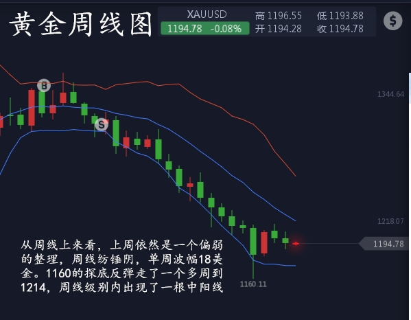 從周線上來看,上周依然是一個偏弱的整理,周線紡錘陰,單周波幅18美金。1160的探底反彈走了一個多周到1214,周線級別內出現了一根中陽線。但是并沒有連續性的陽線,也表明了大的結構和周期來講,黃金依然是偏弱的,或者說沒有明顯的底部反轉信號,行情依然是處于主空節奏。1160的反彈到1214,走了將近兩個周,上上周1214沖高之后,走的是陰陽交替的震蕩回落,而上一周的行情走勢圍繞5日10日均線來回穿插反復走的是一個偏弱的區間整理。盡管ADP和非農數據都是利多的,但是我們看到行情沖高都是沖高回落走勢。