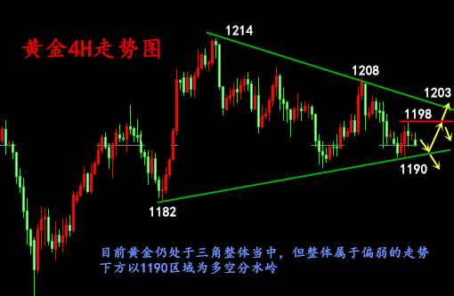技術面上,日線繼續收于十字,目前在布林線中軌附近徘徊,KDJ死叉,MACD金叉,后市走勢仍存較大的變數,關注區間的破位情況,而短周期4小時上黃金本周一直處于布林中下軌運行,而布林走平也是宣告了震蕩的走勢,而早間價格下探1193附近企穩反彈,與之前下探的位置構建了1190-93區域強力的支撐帶,接下來行情就像中軌1198一線進發,只要突破此位行情才有可能重回千二上方,同時這一線也是小時線上軌壓制,要想一下突破還比較艱難,畢竟小時布林還未張口,所以對于后市黃金交易來說就比較簡單,歐盤反彈不突破1198,依然采取高空的策略不變,方向對了不怕路遠,耐心加持久勝過激情與狂熱!1198下持空看跌,若突破1198我將放棄做空,機會靠自己爭取,行情需自己把握,成功不一定有捷徑,但一定有方法。