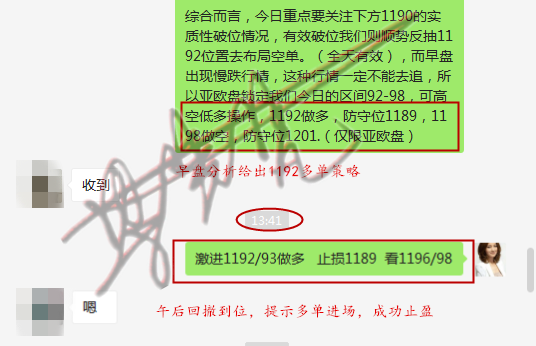 今天的行情跟前幾天類似,早盤回撤,午后上漲那么我們也是摸準規律,早盤孟梵分析給出1192一線多單策略,午后回撤到位,孟梵果斷提示進場多單,歐盤行情上漲多單獲利,賺錢就是這么簡單
