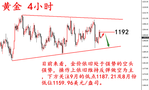 雖然周一呈現(xiàn)探底回升的走勢,但是價格是受到基本面的助推,市場想要再次點(diǎn)燃多頭行情,金價必須再度攻克1200的目標(biāo)位并持穩(wěn)在其上方,然后進(jìn)一步突破下一個上行目標(biāo)1215的關(guān)鍵阻力位,才能逆轉(zhuǎn)走勢。目前來看,金價依舊處于強(qiáng)勢的空頭強(qiáng)勢,操作上依舊維持反彈做空為主,下方關(guān)注9月的低點(diǎn)1187.21及8月份低位1159.96美元/盎司。