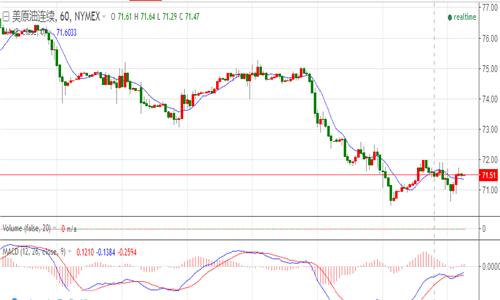 原油方面今日原油開盤在70.970一線,開盤多頭率先發力,油價出現上漲,打到71.205一線,油價進入震蕩,經過一段時間震蕩后71.184位子,多頭開始發力,油價直線上漲,最高打到71.976,隨后油價上漲動能不足,油價出現下跌,油價逐步下跌,最低打到71.264一線,隨后油價反彈,最高打到71.889一線,在打出71.913后,油價出現下跌,最低打到71.014一線,隨后反彈,最高打到71.687一線,油價下跌,最低打到70.621一線,油價反彈,油價逐步上漲,最高打到71.559,收線在71.49一線。