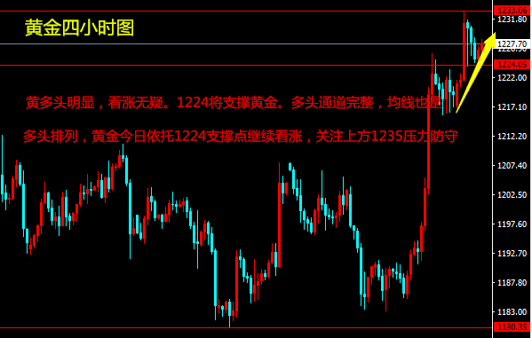 從四小時來看:黃金連續收陽并且直接沖破布林線上軌千二附近的阻力,目前已經形成強勢的看漲趨勢,近期多頭有望得到延續。但是近期4小時依舊承壓于高點1235一線,只有先收復此關鍵阻力位才能繼續上行收復更多失地。而4小時圖上本次的臺階下跌口也正好是在此位置,1235一線將會成為本周小周期的多空強弱臨界點,那么本周可以通過1235一線的突破情況從而決定短線上的反彈的空間大小。日內操作思路上建議低多為主,重點關注上方1235一線壓力,下方1180一線強支撐。短線操作上關注上方1235一線阻力,下方1220一線支撐。