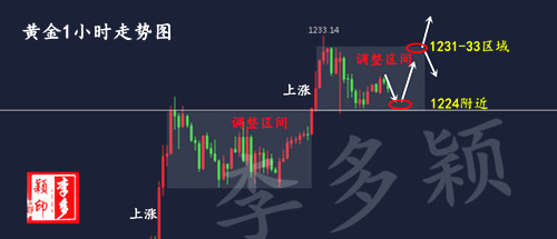 對于今天黃金的趨勢,多穎觀點是以關鍵支撐1224一線看多黃金,昨日金價兩次回撤均持穩1224一線,因此短期一次位置作為支撐位,而多頭的起勢是大陽拉升的起點1221.5位置,這里的防守效果至關重要;而上方壓力方面,短期繼續關注昨日沖高的高點1233美元附近,破位則進一步看前期關鍵壓制1236-38美元。