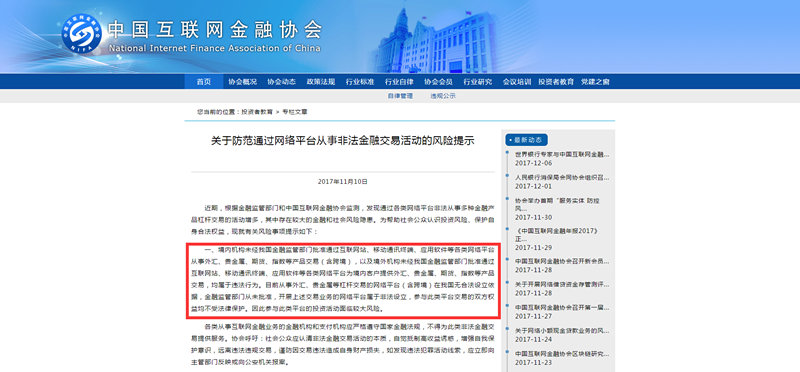 中國互聯網金融協會10日發布風險提示稱,近期,根據金融監管部門和中國互聯網金融協會監測,發現通過各類網絡平臺非法從事多種金融產品杠桿交易的活動增多,其中存在較大的金融和社會風險隱患。互聯網金融協會強調,境內機構未經我國金融監管部門批準通過互聯網站、移動通訊終端、應用軟件等各類網絡平臺從事外匯、貴金屬、期貨、指數等產品交易(含跨境),以及境外機構未經我國金融監管部門批準通過互聯網站、移動通訊終端、應用軟件等各類網絡平臺為境內客戶提供外匯、貴金屬、期貨、指數等產品交易,均屬于違法行為。