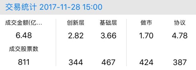 財經365訊 28日總成交6.48億,1363家創新層企業中,344家公司成交2.82億, 467家基礎層公司成交3.66億。387家協議轉讓公司成交4.78億,424家做市轉讓公司成交1.70億。