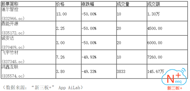 3、創新層跌幅榜上,道爾智控、鼎能開源、誠安達跌幅均為-50.00%;飛宇竹材跌幅-49.93%排名第四; 排名第五的是鴻鑫互聯跌幅-49.33%。