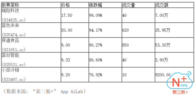 2、1363家創新層漲幅榜中,瑞陽科技以99.09%領漲創新層; 藍色未來漲幅94.17%位列第二;第三名是保通食品,漲幅90.27%; 位列第四和第五的分別是藍創智能和小田冷鏈。