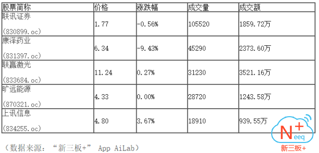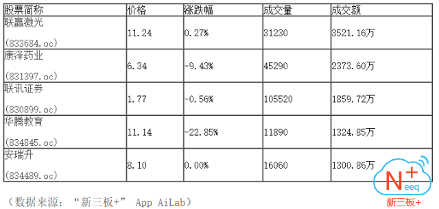 4、創新層活躍股成交額方面,聯贏激光成交3521.16萬元位居榜首,康澤藥業 成交2373.60萬元位列第二;聯訊證券成交1859.72萬元位列第三; 排名第四和第五的分別是華騰教育和安瑞升。